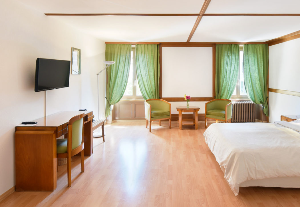 Après une journée de travail ou une randonnée au Creux du Van, profitez d’un agréable moment de repos dans nos chambres doubles, avec une jolie vue sur la terrasse ou le jardin.